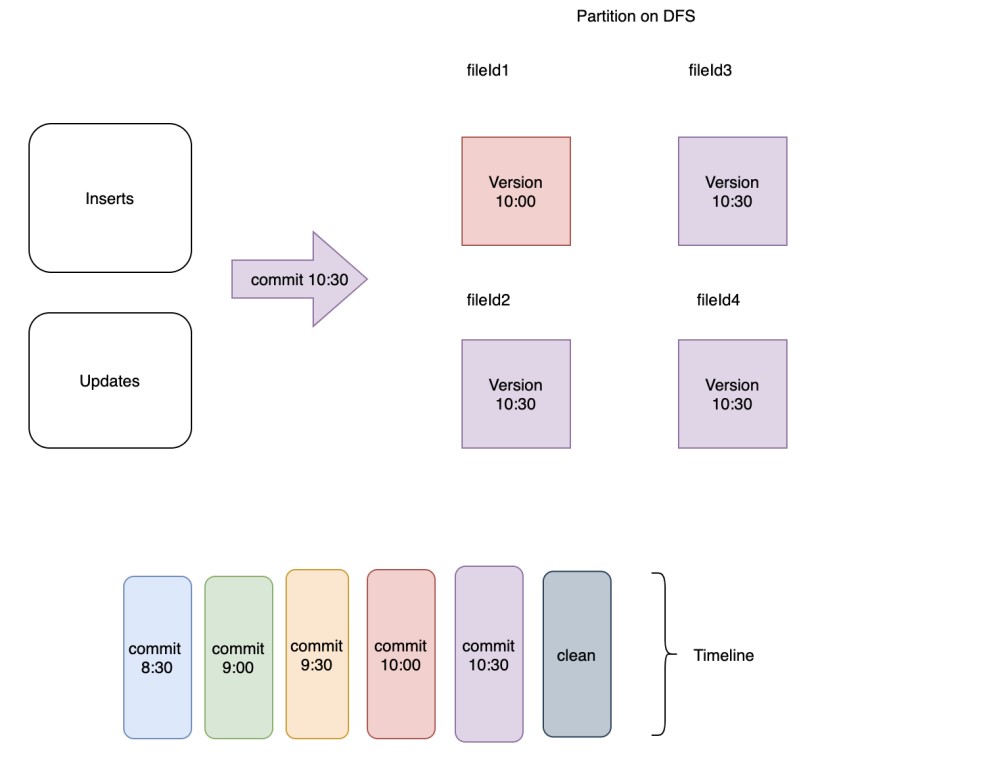 - 對于任何文件組,文件切片的最新版本(包括任何待壓縮的)被保留,其余的清理掉。 如圖 3 所示,如果在commit 10:30之后立即觸發(fā)清理操作,清理服務(wù)將簡單地保留每個文件組中的最新版本并刪除其余的。