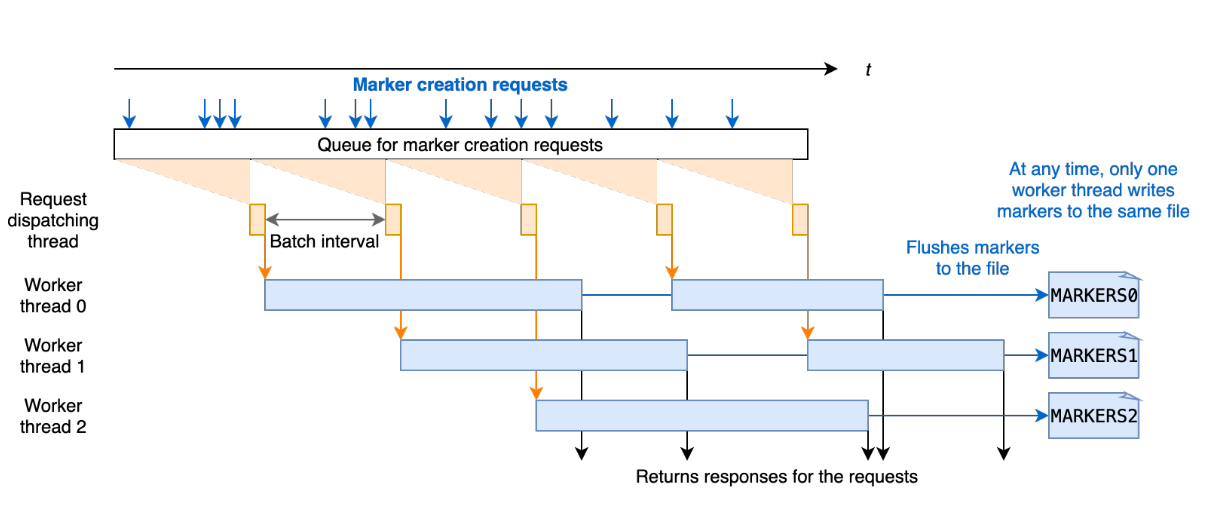 為了提高處理標(biāo)記創(chuàng)建請(qǐng)求的效率,我們?cè)O(shè)計(jì)了在時(shí)間線服務(wù)器上批量處理標(biāo)記請(qǐng)求。 每個(gè)標(biāo)記創(chuàng)建請(qǐng)求在 Javalin 時(shí)間線服務(wù)器中異步處理,并在處理前排隊(duì)。 對(duì)于每個(gè)批處理間隔,例如 20 毫秒,調(diào)度線程從隊(duì)列中拉出待處理的請(qǐng)求并將它們發(fā)送到工作線程進(jìn)行處理。 每個(gè)工作線程處理標(biāo)記創(chuàng)建請(qǐng)求,并通過重寫存儲(chǔ)標(biāo)記的底層文件。有多個(gè)工作線程并發(fā)運(yùn)行,考慮到文件覆蓋的時(shí)間比批處理時(shí)間長,每個(gè)工作線程寫入一個(gè)不被其他線程觸及的獨(dú)占文件以保證一致性和正確性。 批處理間隔和工作線程數(shù)都可以通過寫入選項(xiàng)進(jìn)行配置。