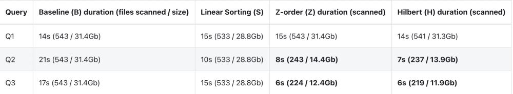 可以看到多列線性排序?qū)τ诎戳校≦2、Q3)以外的列進(jìn)行過(guò)濾的查詢不是很有效,這與空間填充曲線(Z-order 和 Hilbert)形成了非常明顯的對(duì)比,后者將查詢時(shí)間加快多達(dá)3倍。值得注意的是性能提升在很大程度上取決于基礎(chǔ)數(shù)據(jù)和查詢,在我們內(nèi)部數(shù)據(jù)的基準(zhǔn)測(cè)試中,能夠?qū)崿F(xiàn)超過(guò)11倍的查詢性能改進(jìn)!