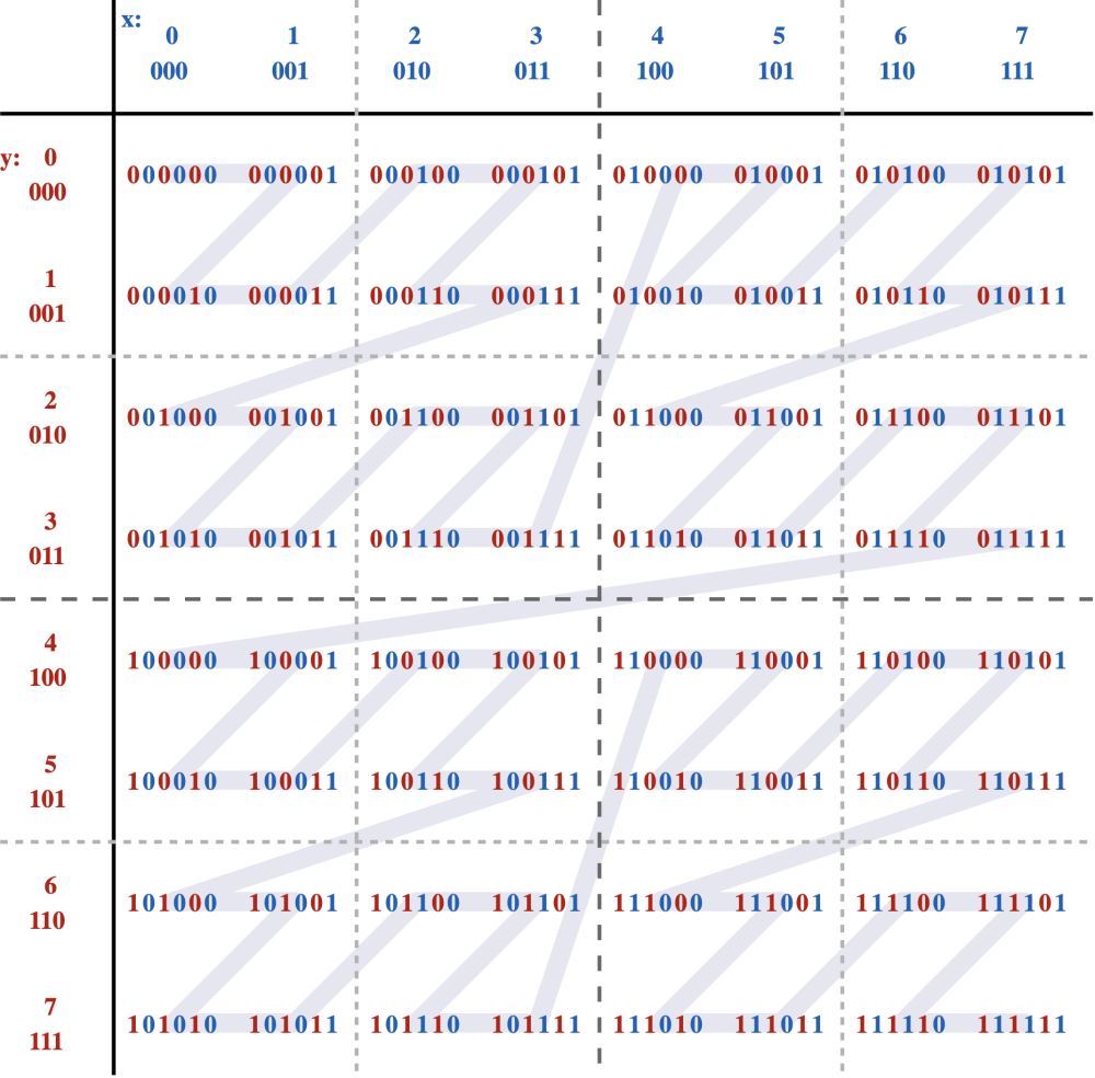 可以看到按照路徑,不是簡(jiǎn)單地先按一個(gè)坐標(biāo) ("x") 排序,然后再按另一個(gè)坐標(biāo)排序,它實(shí)際上是在對(duì)它們進(jìn)行排序,就好像這些坐標(biāo)的位已交織成單個(gè)值一樣: