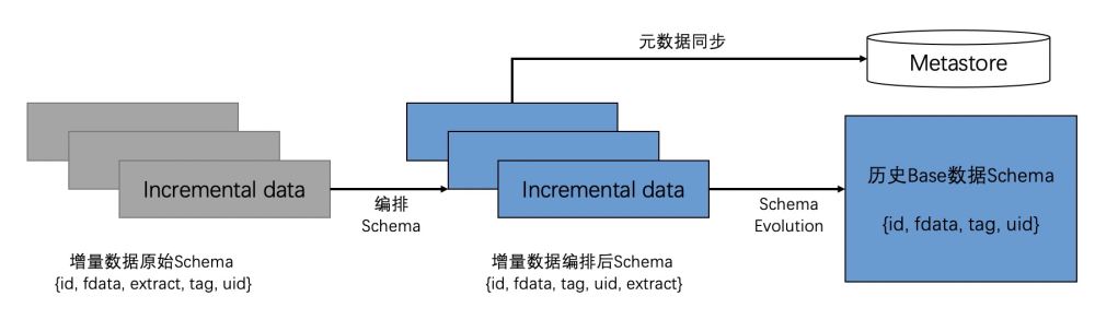 將{id, fdata, extract, tag, uid}變更為{id, fdata, tag, uid, extract},然后調(diào)用Schema Evolution給歷史Base數(shù)據(jù)的Schema添加一個extract字段,最終將調(diào)整后的增量數(shù)據(jù)寫入歷史Base。