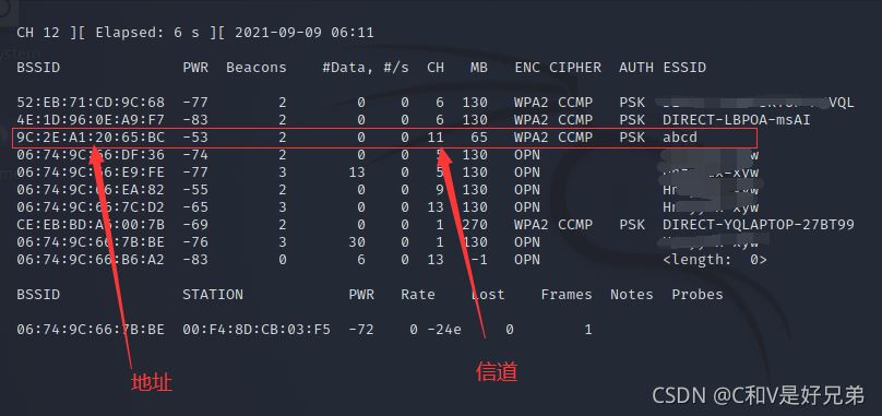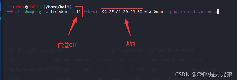 需要更改兩個參數(shù),信道和地址,這兩個參數(shù)分別是掃描wifi時確定要破解的wifi參數(shù)