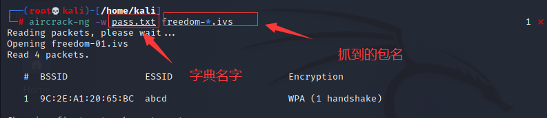 ircrack-ng -w pass.txt freedom-*.ivs