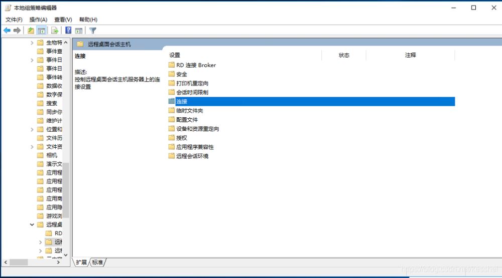 依次點(diǎn)擊展開“計算機(jī)配置>>>管理模板>>>Windows 組件>>>遠(yuǎn)程桌面服務(wù)>>>遠(yuǎn)程桌面會話主機(jī)>>>連接”