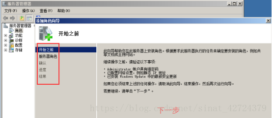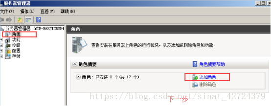 4.進入服務器管理器,點擊左側(cè)的“角色”然后點擊右側(cè)“添加角色”