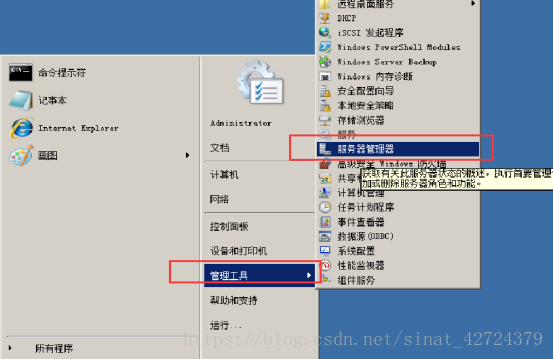 3.打開服務器管理器:系統(tǒng)中點擊“開始菜單程序”——>管理工具——>服務器管理器