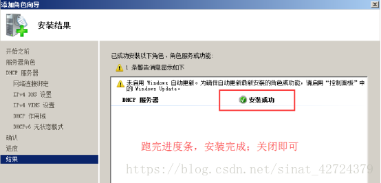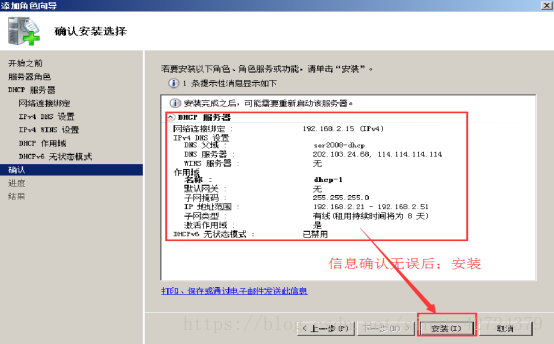 13.在“確認”界面,確認后點擊安裝,開始自動安裝。進度條完成,DHCP也安裝完成。