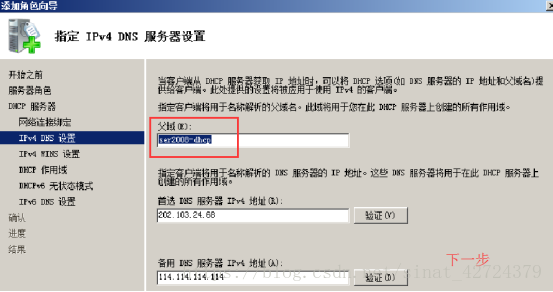 9.接下來到“IPv4DNS設(shè)置”,需要輸入你的父域名和DNS服務器的IP地址,這個域?qū)⒂糜谖覀冊谶@臺DHCP服務器上創(chuàng)建的所有作用域;當DHCP更新IP地址信息的時候,相應的DNS更新會將計算機的名稱到IP地址的關(guān)聯(lián)進行同步。