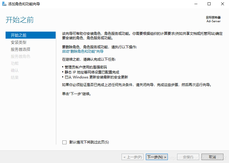 (2)出現(xiàn)“添加角色和功能”界面,下一步 。