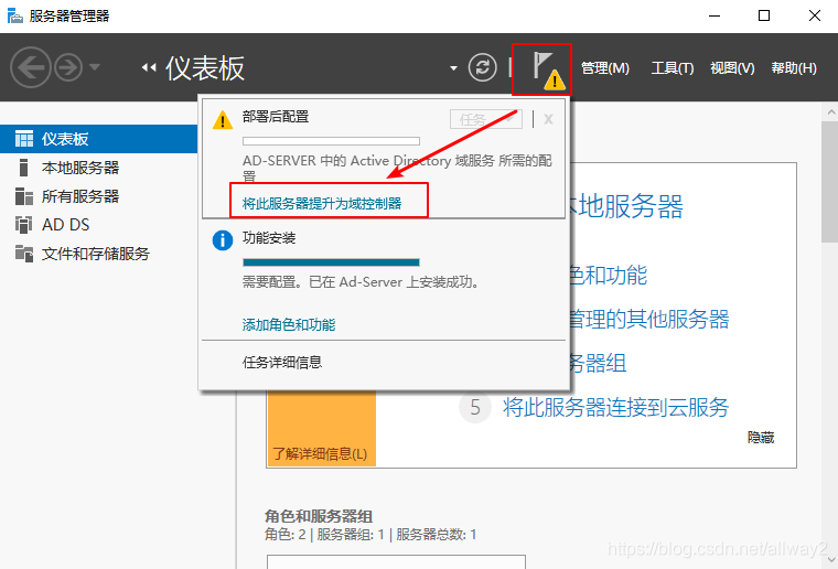 (1)點擊服務(wù)器管理器左側(cè)“AD DS” 、點擊黃色提示部分中的更多。