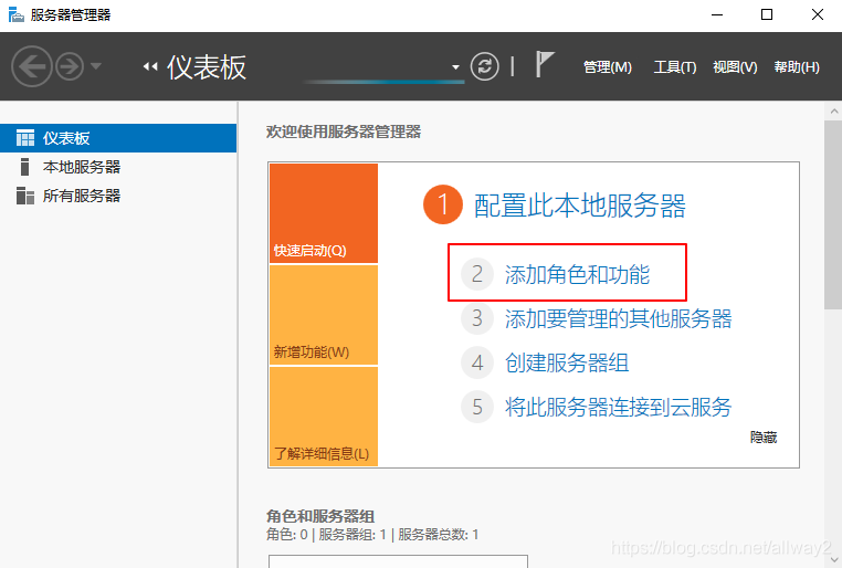 (1)打開服務(wù)器管理器,添加角色和功能。