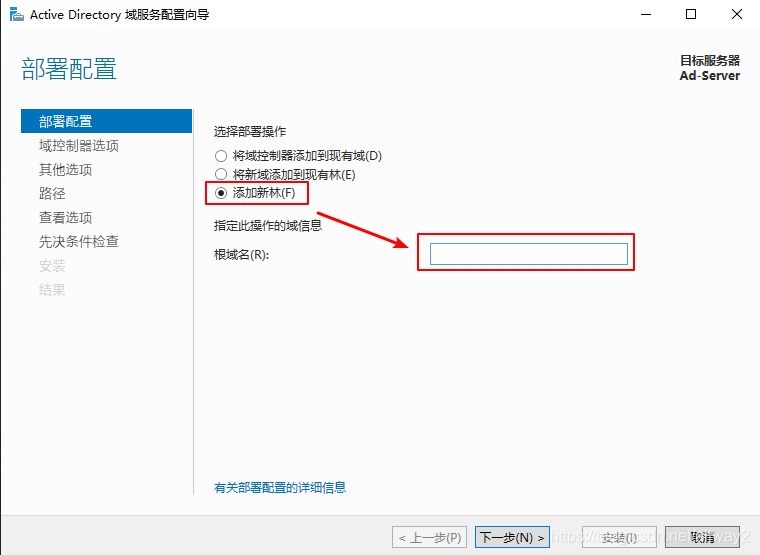(3)進(jìn)入AD域服務(wù)器配置向?qū)Вx擇 “添加新林” ,輸入域,點擊下一步。