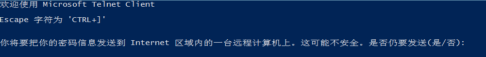 檢驗(yàn)Telnet服務(wù)是否開(kāi)啟:命令行界面中輸入 telnet127.0.0.1,出現(xiàn)如下圖證明啟動(dòng)成功