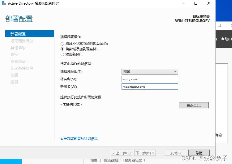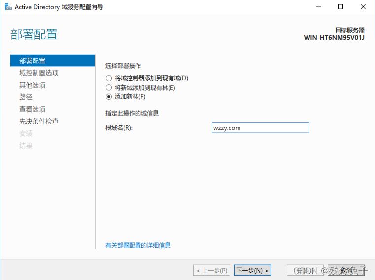 選擇將新域添加到現(xiàn)有林---選擇域類型為樹域---輸入父域名wzzy.com2022-1林的名稱,輸入新的域名 域名隨意