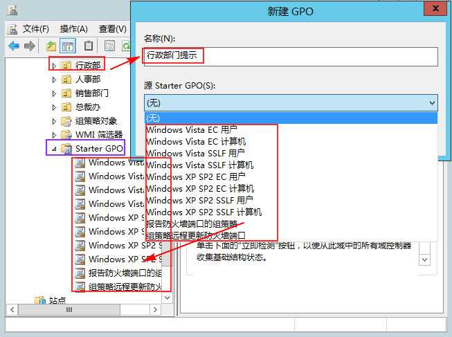 在名稱里面填寫要創(chuàng)建的組策略的名稱,而在源這里可以選擇“無”進(jìn)行自己自定義的組策略配置,或者選擇下拉列表中已經(jīng)是系統(tǒng)默認(rèn)新建好的模版策略,而這些模版策略都存放在“StarterGPO”下面,如果方便的話,建議可以直接在“StarterGPO”下面建立配置模版,然后在組織OU下面調(diào)用就可以了,這樣不用每次需要重復(fù)查找配置策略。