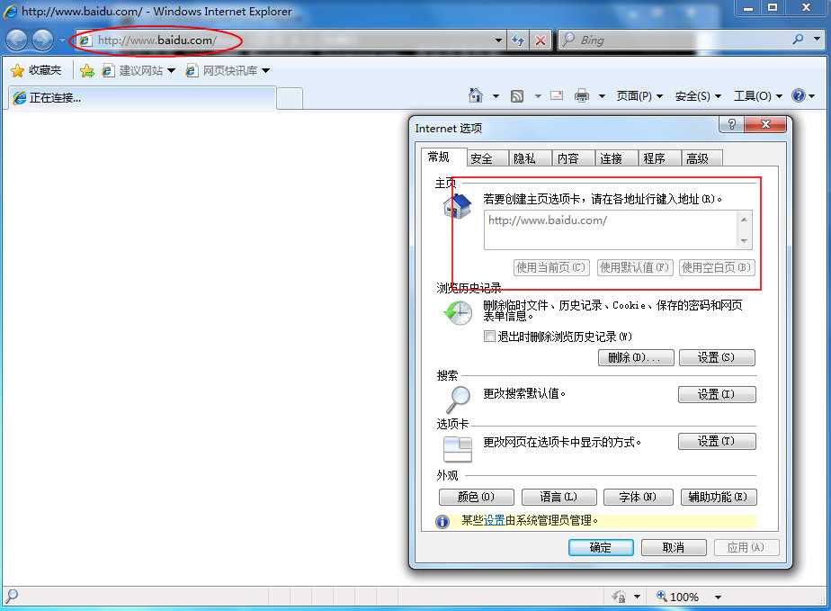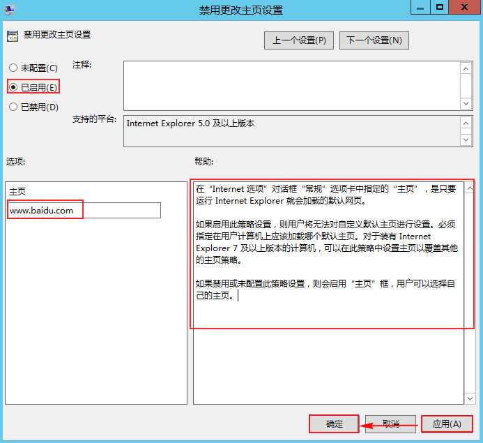 首先點(diǎn)“啟用”然后在下面的主頁處添加主頁網(wǎng)址,這里以百度為例,這樣最終實(shí)現(xiàn)的目的即在client端,使用行政部門下的賬戶“popo”登錄以后,打開瀏覽器的默認(rèn)打開的第一個網(wǎng)頁就是百度,而且“popo”用戶沒有權(quán)限來進(jìn)行主頁的修改。