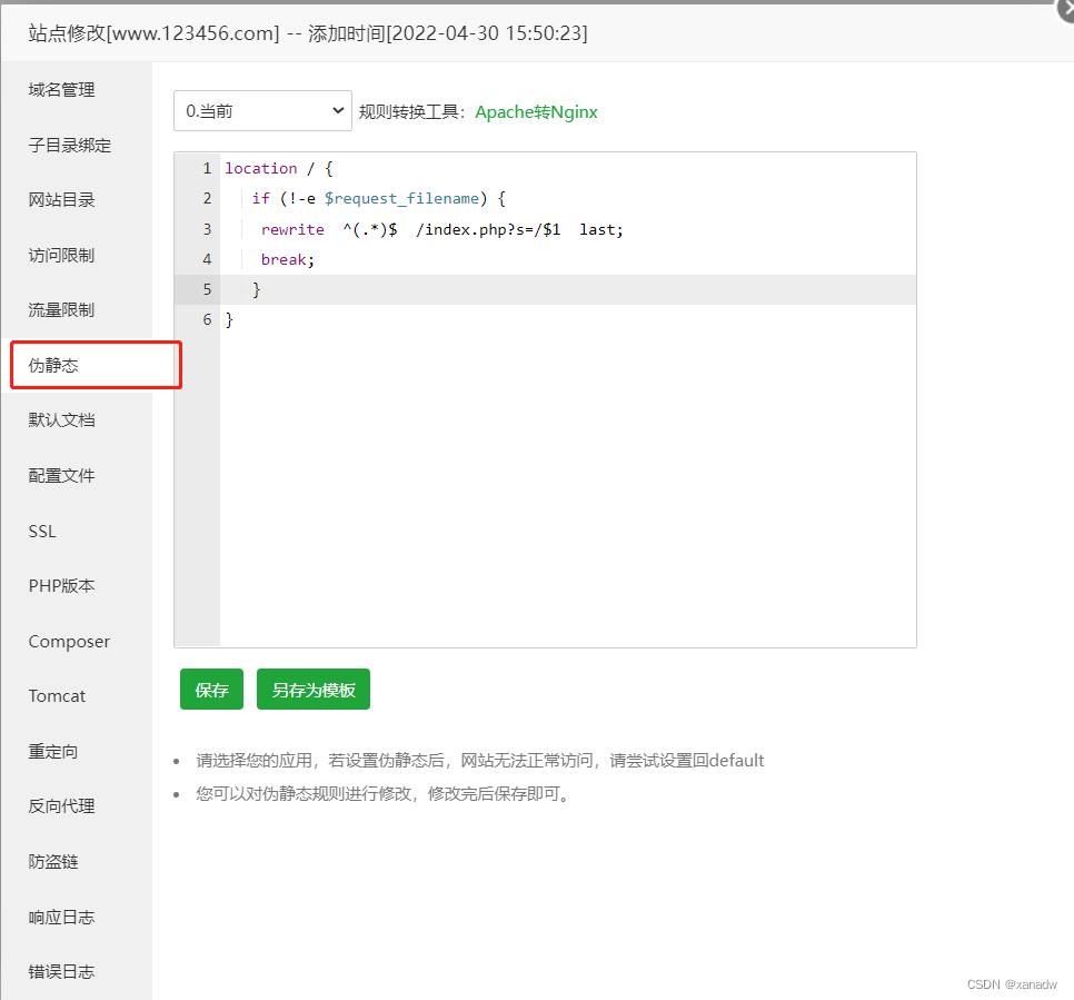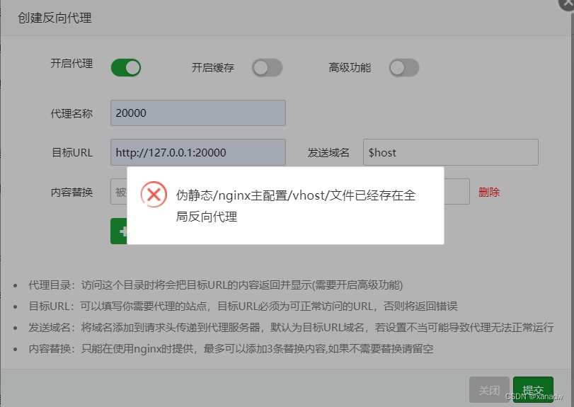 阿里云搭建的寶塔Linux面板,上面已經(jīng)搭建過其它網(wǎng)站了,我現(xiàn)在給一個新增的網(wǎng)站增加一個反向代理端口,但是通過寶塔面板添加反向代理的時候,出現(xiàn)了下圖偽靜態(tài)的錯誤。