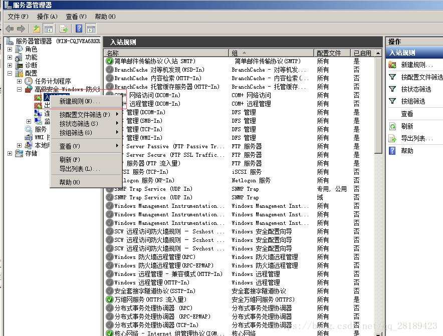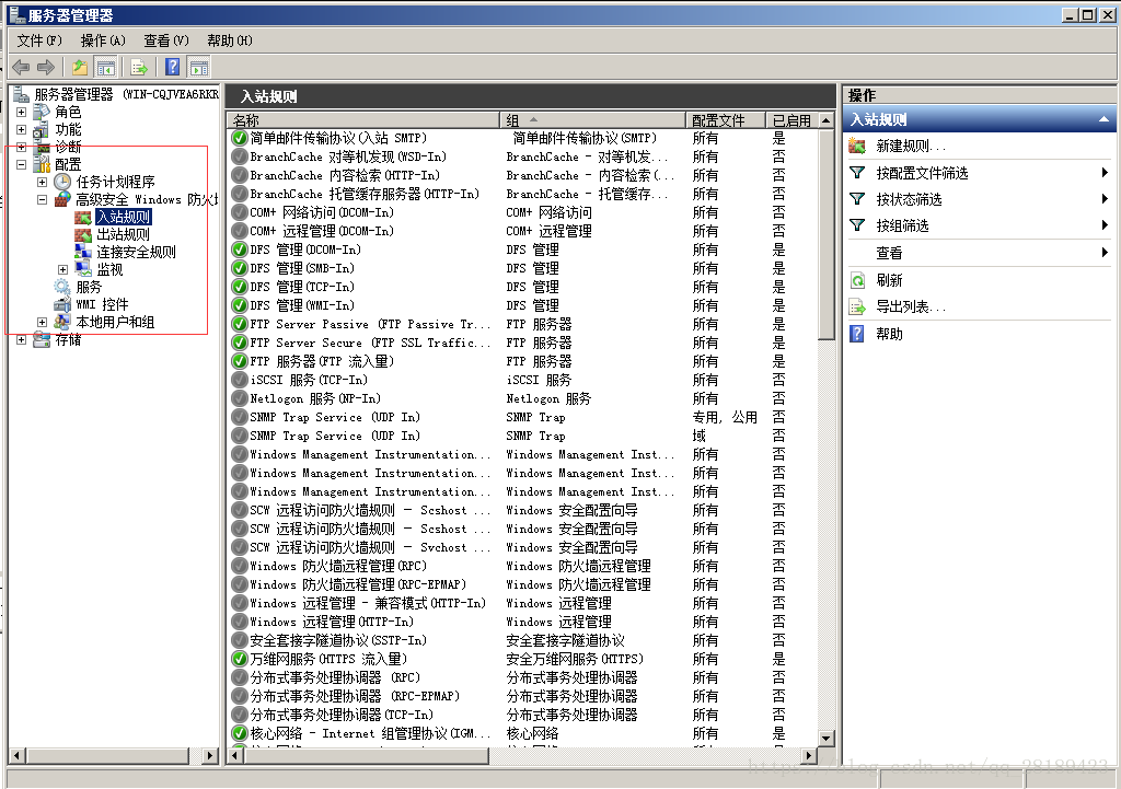 打開服務(wù)器管理器->配置->高級安全windows防火墻設(shè)置->入站規(guī)則