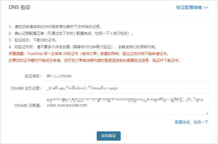 修改后,在freessl的DNS驗(yàn)證頁(yè)面【點(diǎn)擊驗(yàn)證】,此處需要注意一般得等幾分鐘才能驗(yàn)證通過(guò)。