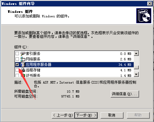 3、在組件向?qū)е姓业健緫?yīng)用程序服務(wù)器】雙擊打開,勾選【Internet信息服務(wù)(IIS)】和【應(yīng)用程序服務(wù)器控制臺(tái)】,勾選后先不要那么快點(diǎn)確定