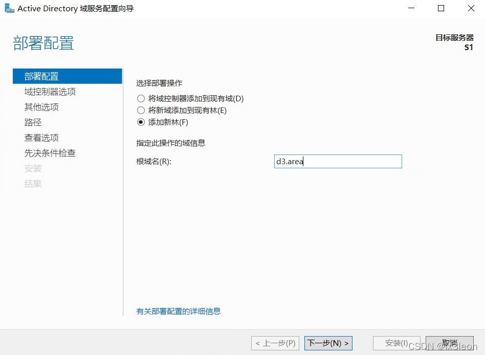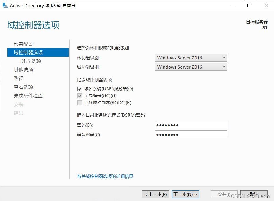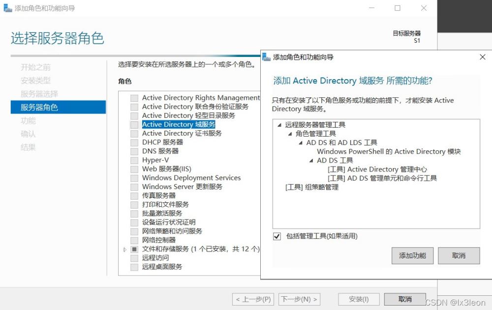 - S1安裝【DNS】和【Active Directory域】,并配置為域控制器。