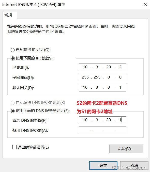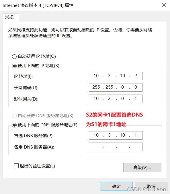 在S2和S3兩臺節(jié)點上,將兩個網卡的首選DNS設為S1的兩個IP,否則無法解析d3.area域名,會導致無法加入域。