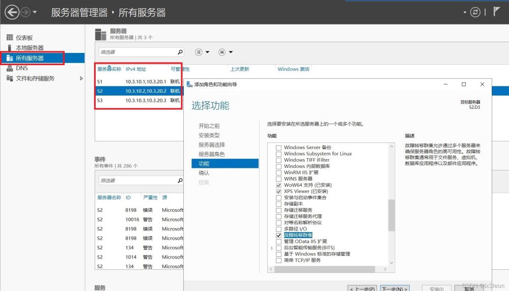 在S1的服務器管理器 – 所有服務器中為3臺節(jié)點都添加【故障轉移群集】功能。