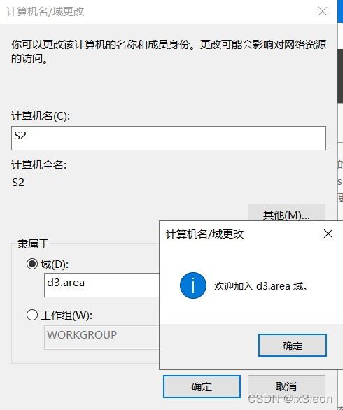 在S2和S3兩臺節(jié)點上的計算機改名處,加入d3.area域,提示輸入S1賬戶密碼,成功加入域后重啟S2和S3。
