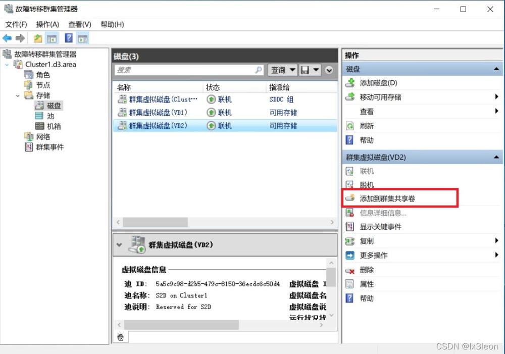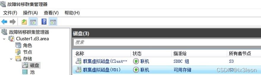 卷創(chuàng)建完成后,打開故障轉移群集管理器 – 存儲 – 磁盤:可以看到群集虛擬磁盤VD1現在就承載于S3上。