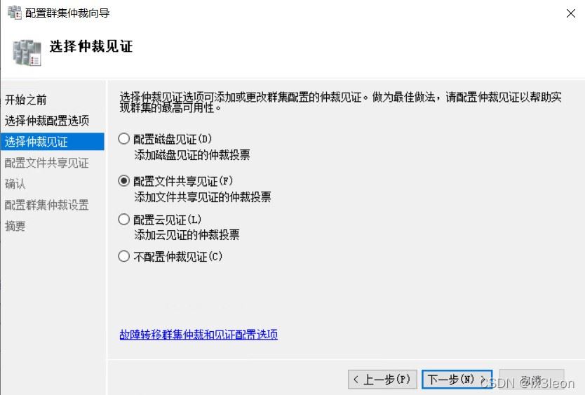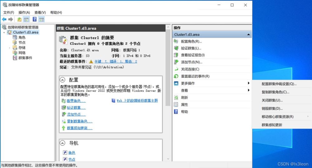 只有2臺節(jié)點組成群集,還需要配置一個外部見證,以保證在任意節(jié)點故障時,也能夠選舉出1臺多數得票的節(jié)點。在故障轉移群集管理器中,選擇群集,更多操作