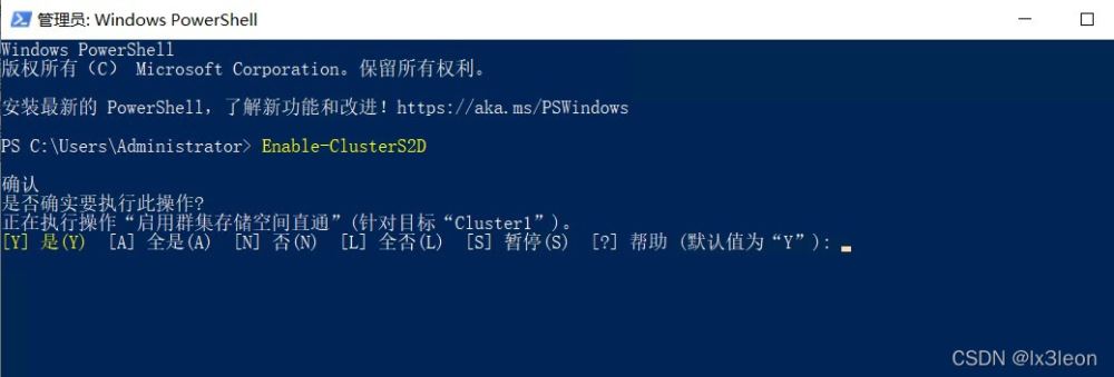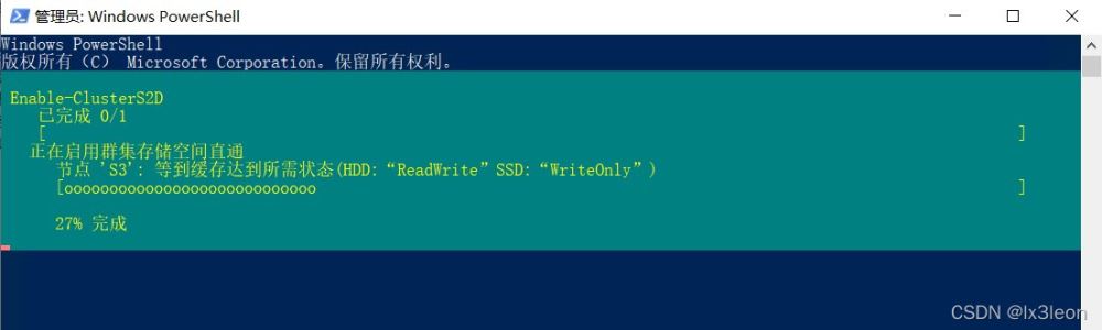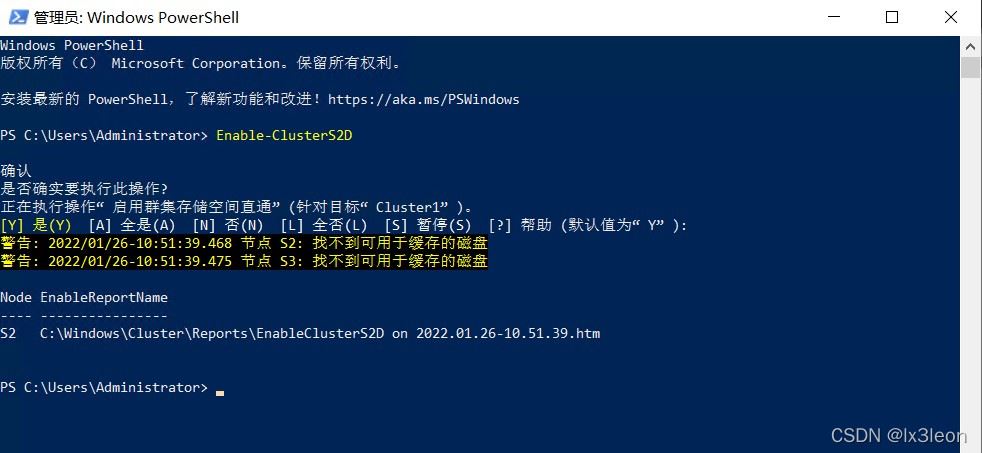 萬事俱備,接下來在S2或S3其中1臺節(jié)點上,用管理員身份打開PowerShell,執(zhí)行如下命令開啟S2D功能:Enable-ClusterS2D