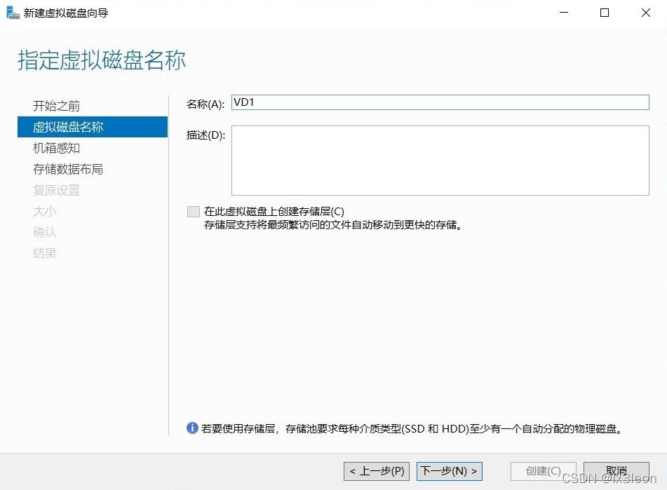 設置虛擬磁盤名稱為VD1,存儲數據布局為Mirror,復原類型為雙向鏡像,容量設置了500GB。如果對存儲復原有要求的話,可以參照微軟文檔,預留一定的容量。