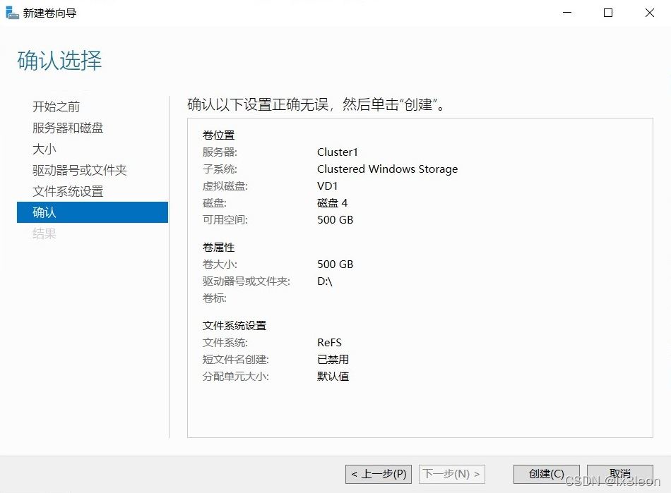 虛擬磁盤創(chuàng)建完成后,接著會創(chuàng)建卷。服務器選擇Cluster1,磁盤選擇VD1,容量同樣設為了500GB,驅動器號設置為D,文件系統(tǒng)ReFS。