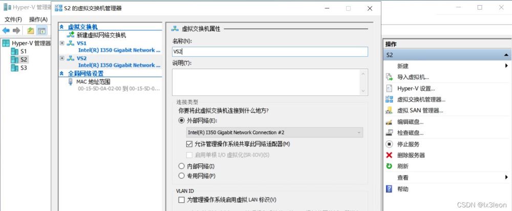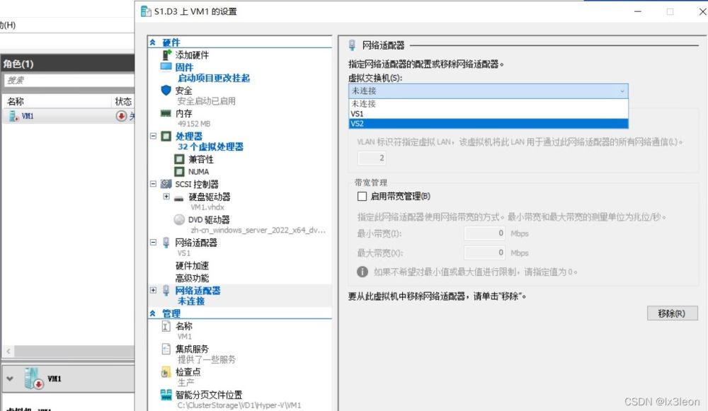 在S1上打開Hyper-V管理器,將S2和S3這兩臺節(jié)點的虛擬交換機名稱都設置為VS1和VS2,從而避免因虛擬交換機名稱不一致,而造成虛擬機無法轉移的問題。