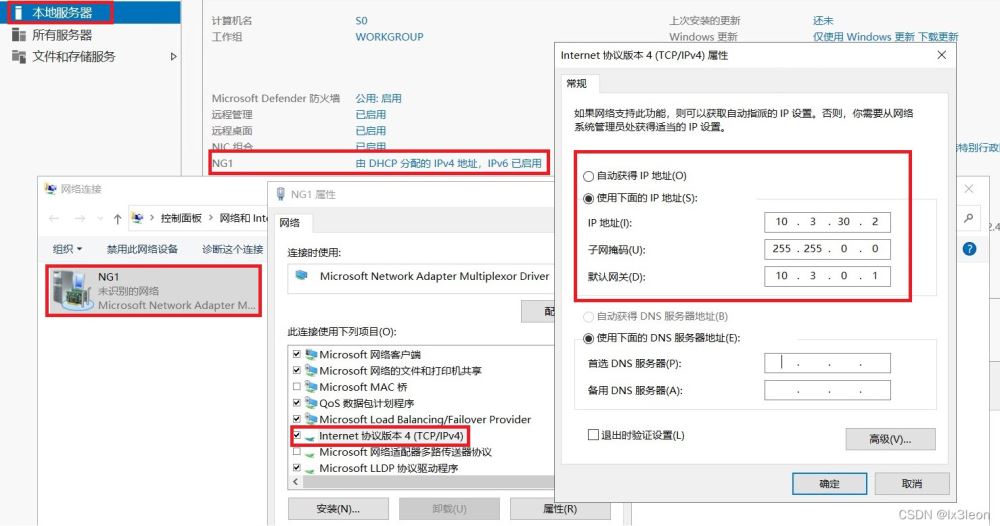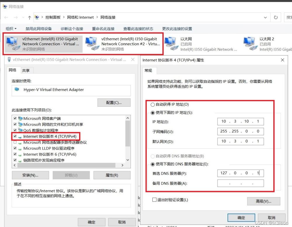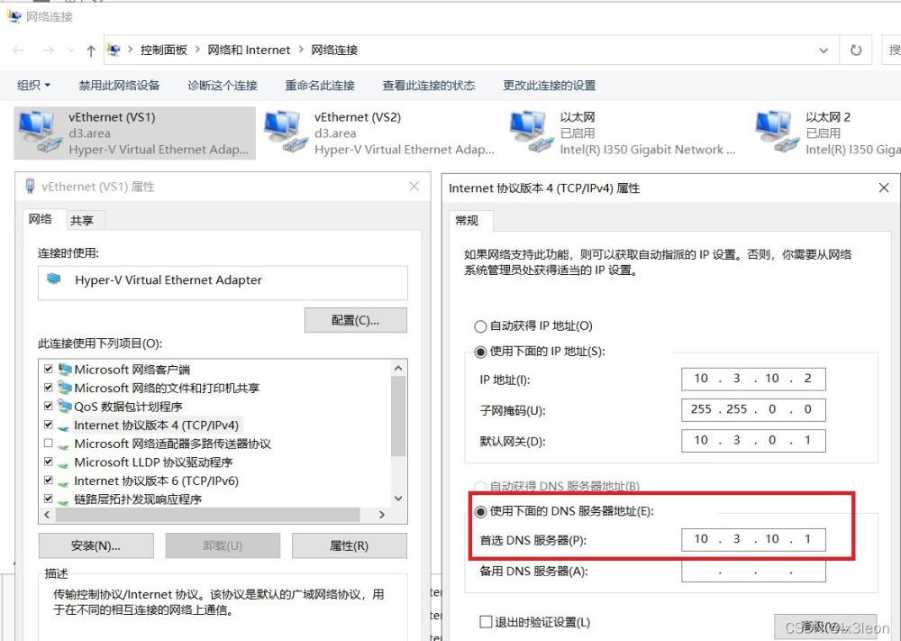3臺節(jié)點的Hyper-V角色添加完成后,都要重啟。重啟后,3臺節(jié)點都會多出2個虛擬網卡,而物理網卡的IP也會消失。第一時間將這兩個虛擬網卡的IP給設置為一開始配置的那些IP,另外2個物理網卡不用動,3臺節(jié)點都要設置。S1的DNS要指向自己。S2和S3的DNS還是指向S1。