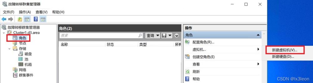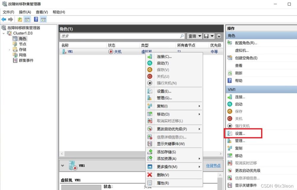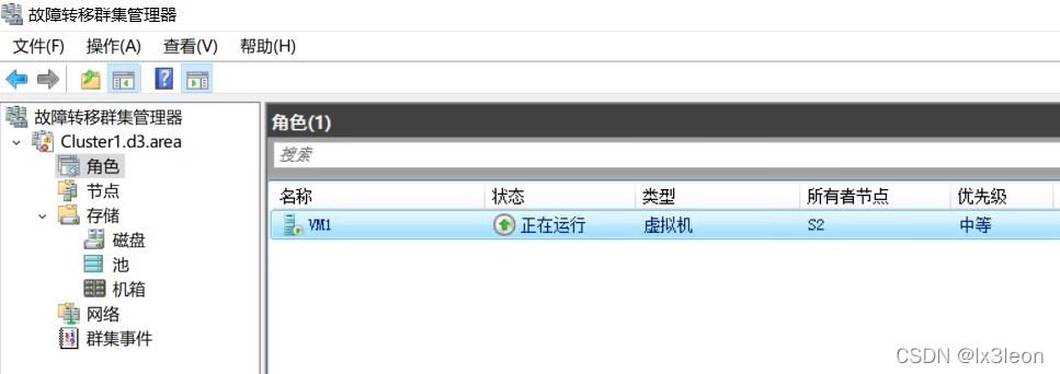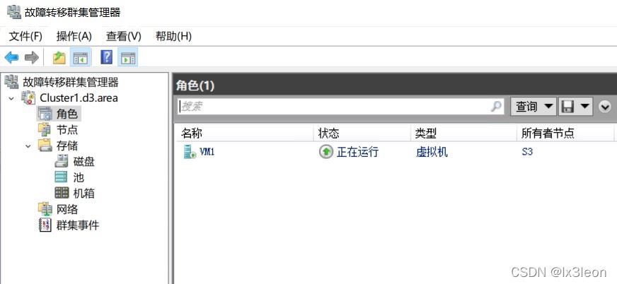 在S1打開故障轉移群集管理器,連接到Cluster1.d3.area群集,查看角色,此時虛擬機VM1正在S2節(jié)點上運行。