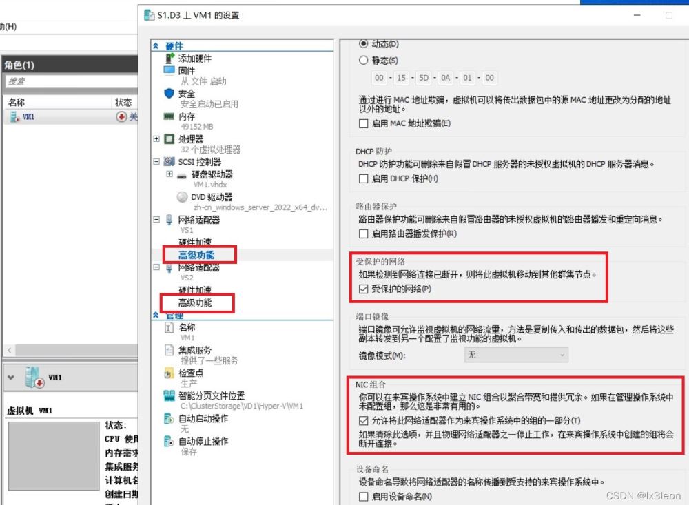 然后在2個網絡適配器的【高級功能】里,將受【保護的網絡】和【NIC組合】選中。