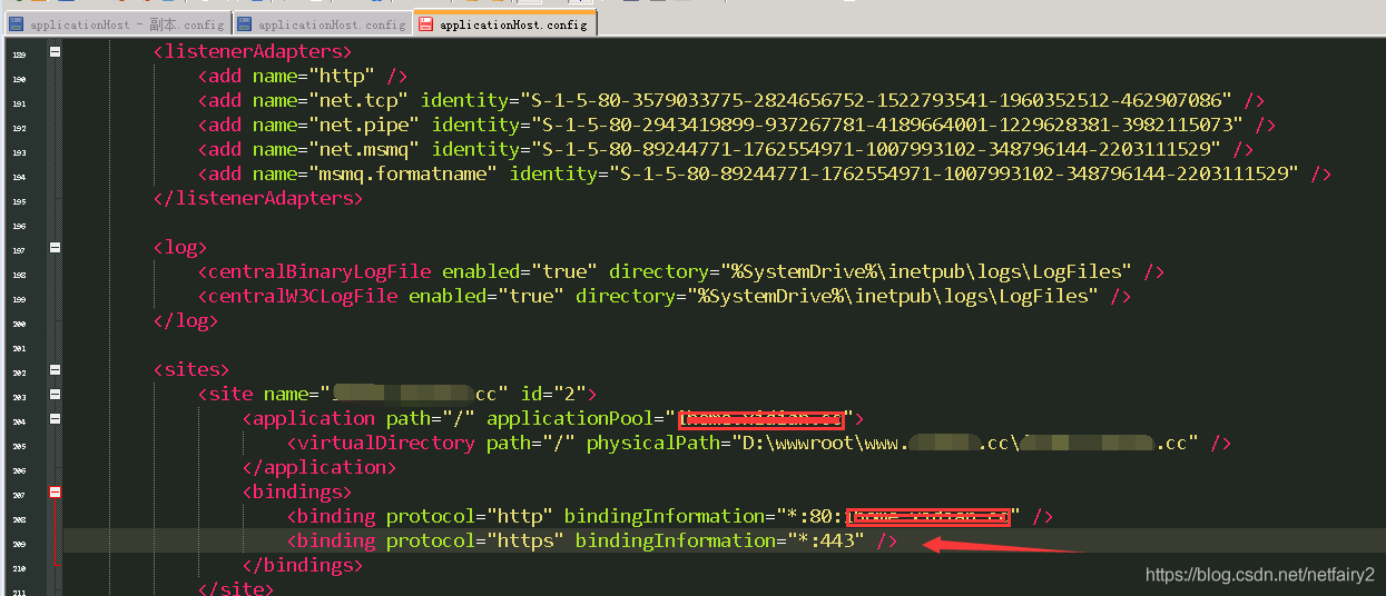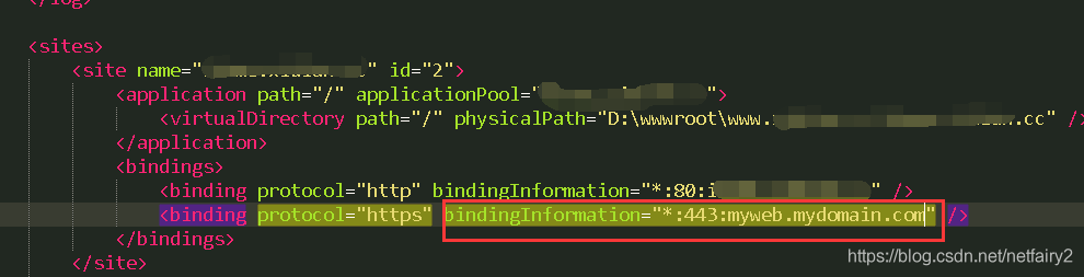 會(huì)發(fā)現(xiàn)對(duì)應(yīng)的網(wǎng)站域名下面bindingInformation=":443:" 缺少了對(duì)應(yīng)域名,添加上你自己的主機(jī)域名保存即可。