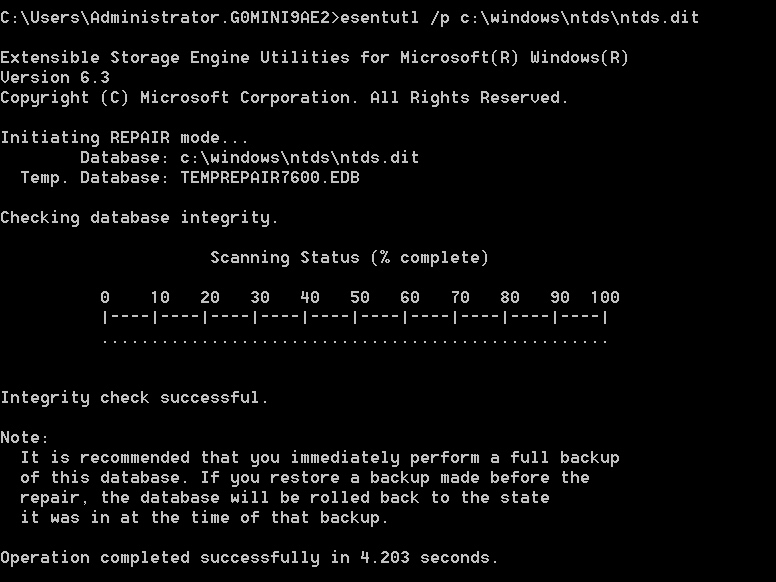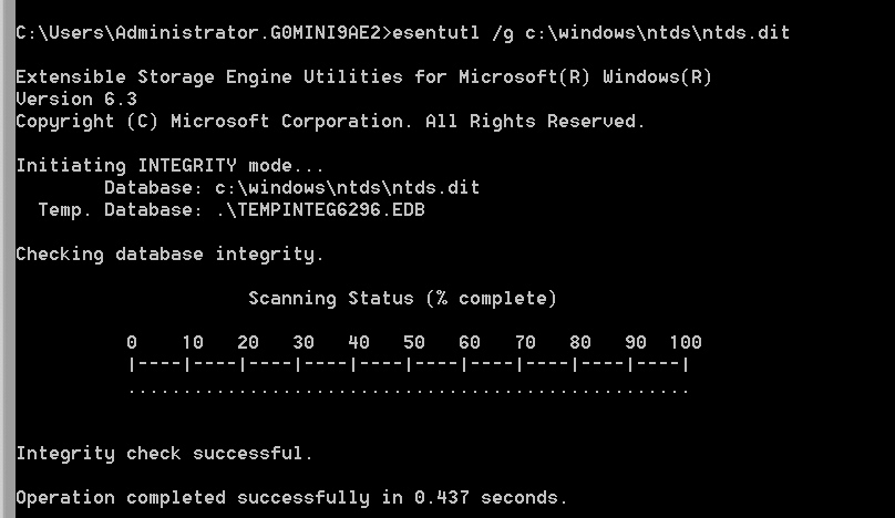 ①輸入: esentutl /g c:\windows\ntds\ntds.dit