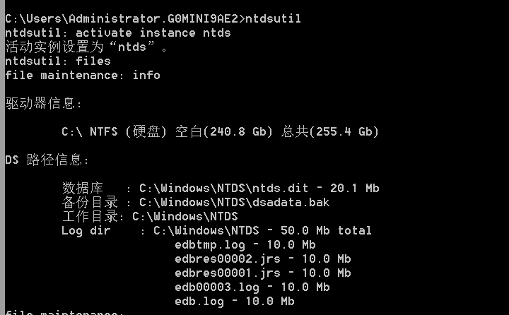 ④輸入: info 可查看目錄服務(wù)文件ntds.dit位置