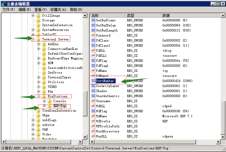 [HKEY_LOCAL_MACHINE\SYSTEM\CurrentControlSet\Control\Terminal Server\Wds\rdpwd\Tds\tcp]其下的”PortNumber”鍵值所對應(yīng)的就是端口號,此處設(shè)置為2121
