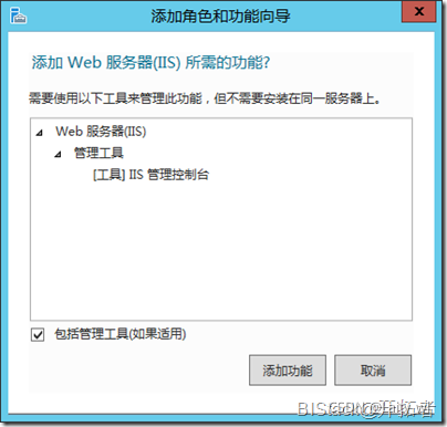 在勾選【W(wǎng)eb服務(wù)器(IIS)】選項時候,可能會彈出如下類似的需要添加其它角色和功能的確認(rèn)框,點擊【添加功能】即可。