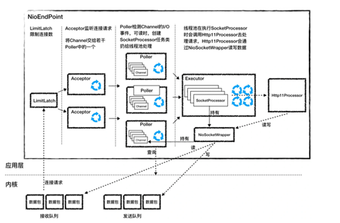 org.apache.tomcat.util.net.AbstractEndpoint#bindWithCleanup中初始化網(wǎng)絡(luò)監(jiān)聽、SSL{ .... serverSock = ServerSocketChannel.open(); socketProperties.setProperties(serverSock.socket()); InetSocketAddress addr = new InetSocketAddress(getAddress(), getPortWithOffset()); // 當(dāng)應(yīng)用層面的連接數(shù)到達(dá)最大值時(shí),操作系統(tǒng)可以繼續(xù)接收連接,那么操作系統(tǒng)能繼續(xù)接收的最大連接數(shù)就是這個(gè)隊(duì)列長(zhǎng)度,可以通過(guò)acceptCount 參數(shù)配置,默認(rèn)是 100 serverSock.bind(addr, getAcceptCount()); } serverSock.configureBlocking(true); //mimic APR behaviororg.apache.tomcat.util.net.NioEndpoint#startInternal中初始化業(yè)務(wù)處理的線程池、連接限制器、Poller線程、Acceptor線程如何做到高性能的