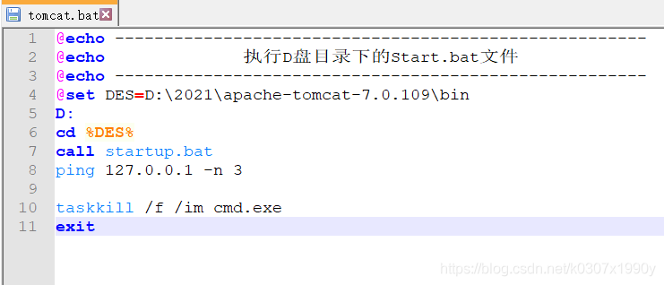 @echo ------------------------------------------------------ @echo ? ? ? ? ? ? ?執(zhí)行D盤目錄下的Start.bat文件 @echo ------------------------------------------------------ @set DES=D:\2021\apache-tomcat-7.0.109\bin D: cd %DES% call startup.bat ping 127.0.0.1 -n 3 taskkill /f /im cmd.exe exit