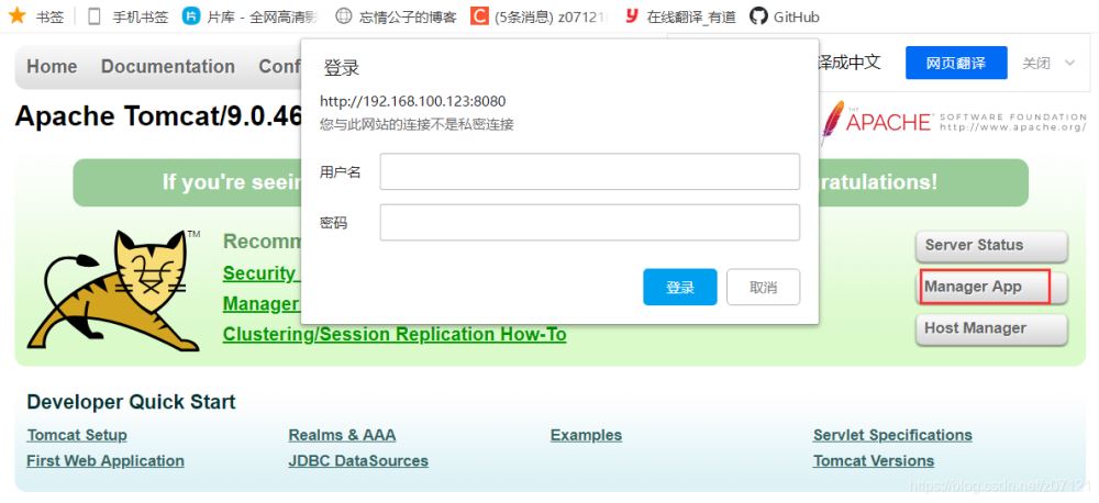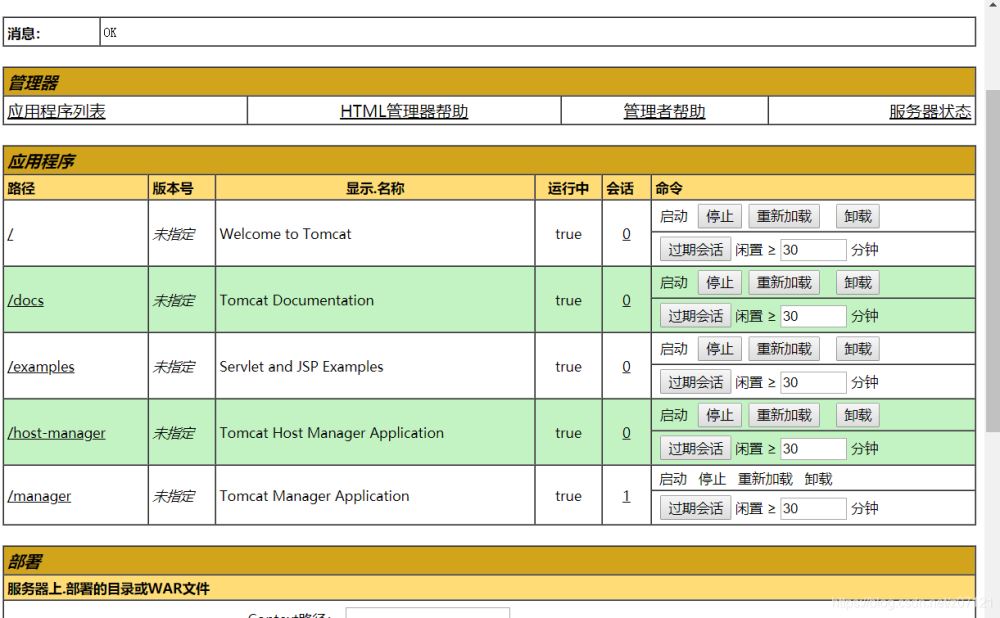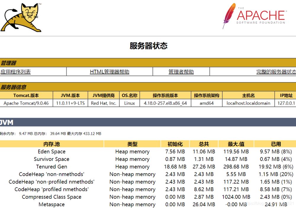 [root@localhost conf]# ls Catalina context.xml logging.properties tomcat-users.xsd catalina.policy jaspic-providers.xml server.xml web.xml catalina.properties jaspic-providers.xsd tomcat-users.xml [root@localhost conf]# vim tomcat-users.xml <role rolename="manager-gui"/> <role rolename="admin-gui"/> //在配置文件中加入此行 <user username="zdj" password="123456" roles="manager-gui,admin-gui"/> //加入admin-gui 因為修改了配置文件,,這里需要重啟 [root@localhost tomcat]# ./bin/catalina.sh stop Using CATALINA_BASE: /usr/local/tomcat Using CATALINA_HOME: /usr/local/tomcat Using CATALINA_TMPDIR: /usr/local/tomcat/temp Using JRE_HOME: /usr Using CLASSPATH: /usr/local/tomcat/bin/bootstrap.jar:/usr/local/tomcat/bin/tomcat-juli.jar Using CATALINA_OPTS: NOTE: Picked up JDK_JAVA_OPTIONS: --add-opens=java.base/java.lang=ALL-UNNAMED --add-opens=java.base/java.io=ALL-UNNAMED --add-opens=java.base/java.util=ALL-UNNAMED --add-opens=java.base/java.util.concurrent=ALL-UNNAMED --add-opens=java.rmi/sun.rmi.transport=ALL-UNNAMED [root@localhost tomcat]# ./bin/catalina.sh start Using CATALINA_BASE: /usr/local/tomcat Using CATALINA_HOME: /usr/local/tomcat Using CATALINA_TMPDIR: /usr/local/tomcat/temp Using JRE_HOME: /usr Using CLASSPATH: /usr/local/tomcat/bin/bootstrap.jar:/usr/local/tomcat/bin/tomcat-juli.jar Using CATALINA_OPTS: Tomcat started. [root@localhost tomcat]# ss -antl State Recv-Q Send-Q Local Address:Port Peer Address:Port Process LISTEN 0 128 0.0.0.0:22 0.0.0.0:* LISTEN 0 128 [::]:22 [::]:* LISTEN 0 1 [::ffff:127.0.0.1]:8005 *:* LISTEN 0 100 [::1]:8009 [::]:* LISTEN 0 100 *:8080 *:*