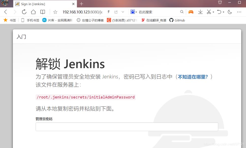 查看密碼 [root@localhost webapps]# cat /root/.jenkins/secrets/initialAdminPassword f9770e45cc67460586e22f049b96e91d
