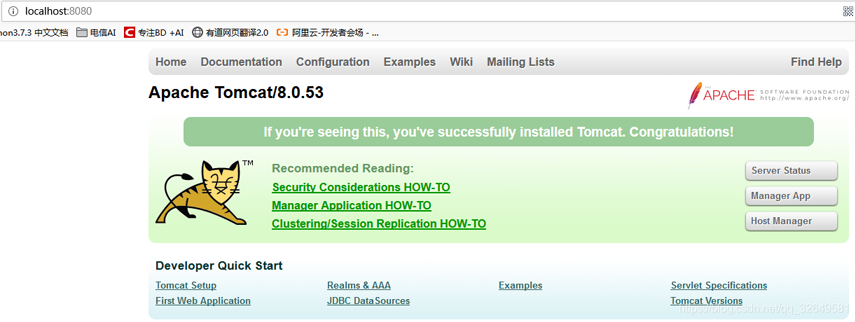 4.如果以上問題都解決了,在瀏覽器的地址欄中輸入“http://localhost:8080”,如果出現(xiàn)一個有小貓的界面,那就說明問題已經(jīng)解決了,但是如果仍然有問題,就按照上面的方法來檢查,看是哪兒出現(xiàn)了錯誤。打開的網(wǎng)址的時候前提startup.bat已經(jīng)在運行。不然還是不能正常顯示的。