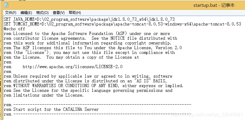 2、然后將startup.bat進(jìn)行編輯,在文件內(nèi)容的開頭加入如下內(nèi)容,具體根據(jù)自己安裝的位置來確定。